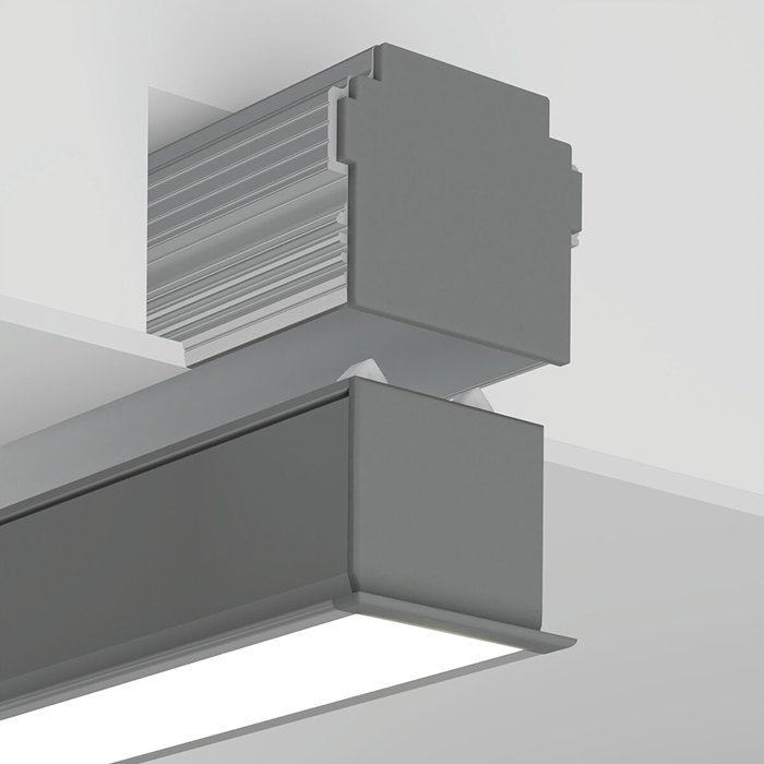 - Záslepky se nasazují na profil z boku. Vybraný montážní difuzor se do profilu vtlačí a vmáčkne z čelní strany.