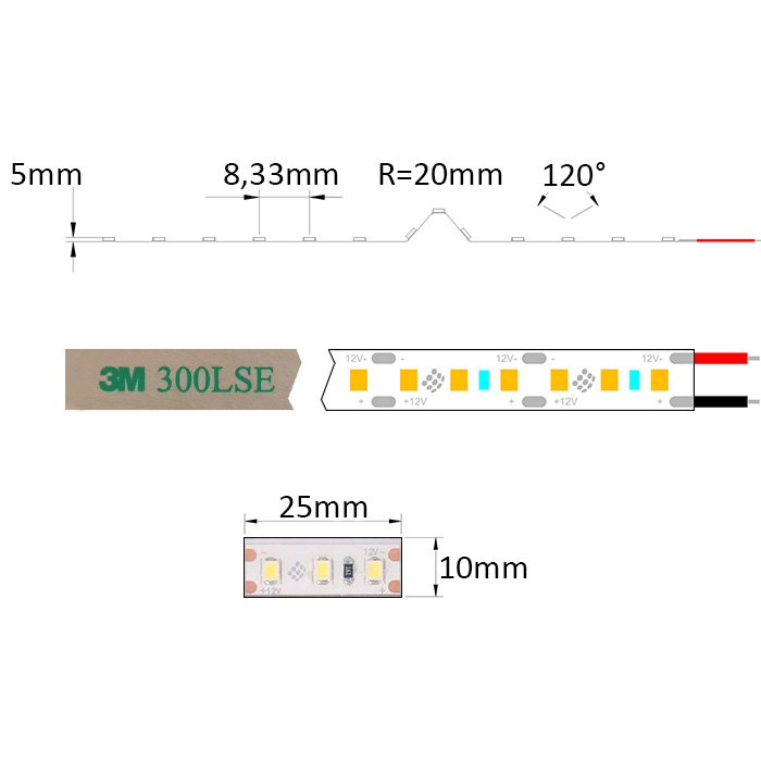 - SMD2835 (Surface-Mounted Device) technologie - zajišťuje vysokou účinnost díky efektivnímu pasivnímu chlazení LED čipů. Diody jsou umístěny v pouzdře na hliníkové chladicí podložce, což prodlužuje jejich životnost a umožňuje LED pásku SMD2835 12V dosahovat vynikající svítivosti a účinnosti s vyzařovacím úhlem 120°.