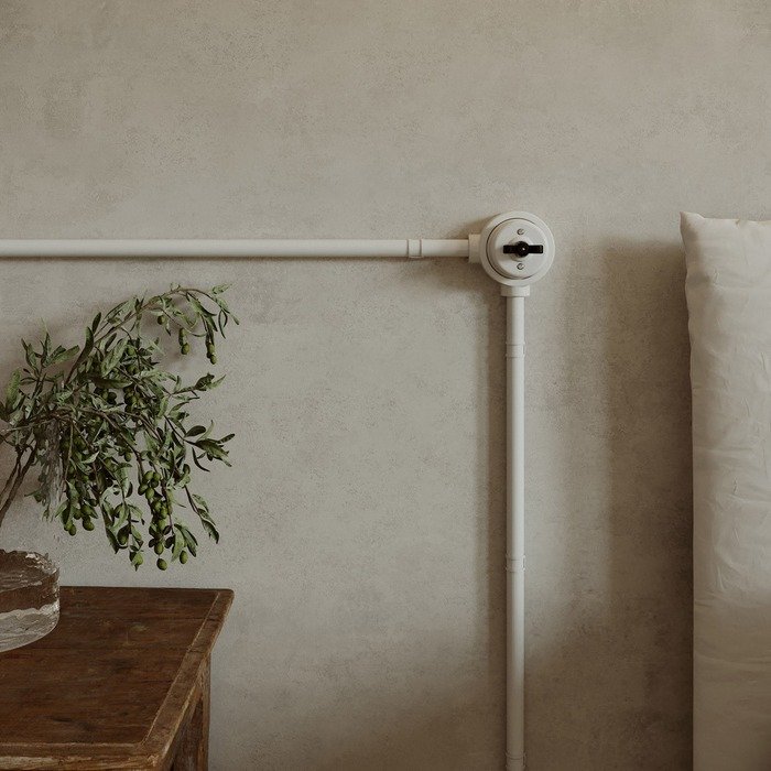 Bílý otočný porcelánový vypínač s rámečkem a označením P-Nut-Base je praktickým a stylovým řešením pro vytvoření povrchové elektroinstalace systému Creative-Tube. Vyniká tradičním řemeslným zpracováním s autentickými estetickými prvky porcelánu a zároveň odpovídá současným standardům kvality, bezpečnosti a mechanické odolnosti. Originálně řešený otočný mechanismus, inspirovaný retro vzhledem motýlkové matice, zajišťuje nejen pohodlné a intuitivní ovládání světel, ale zároveň slouží jako výrazný designový prvek, který zaujme na první pohled v jakémkoli interiéru.