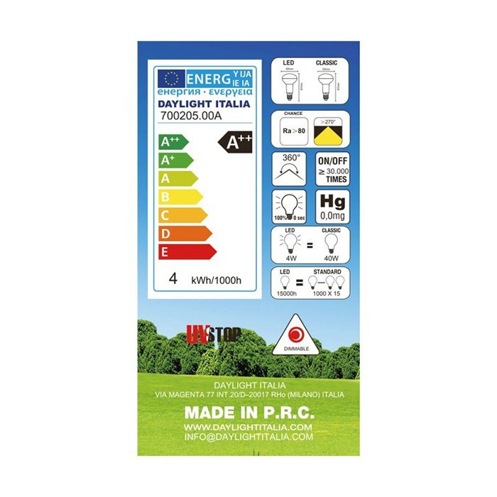 Kvalitu, efektivitu provozu a dlouhou životnost přes 15 000 hodin garantuje světově respektovaný výrobce žárovek DayLight Italia. Precizní technické zpracování se zaměřením na každý detail stmívací bodové žárovky R50 je to, čím tato společnost dosáhla významného podílu na trhu světelných zdrojů. Kvalitní stmívatelná R50 žárovka s technickými vlastnostmi jako: IC Driver Design a COB LED chip, (Ra)CRI80 dokáže v mnoha případech ospravedlnit vyšší pořizovací náklady.