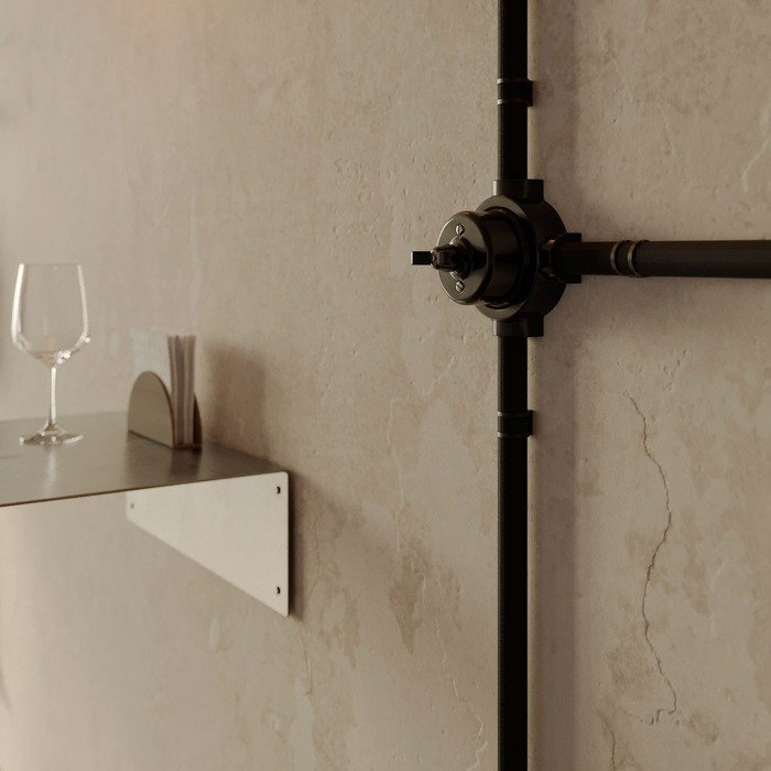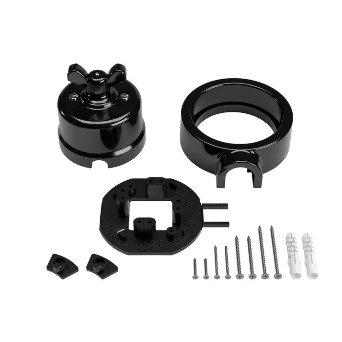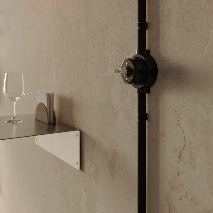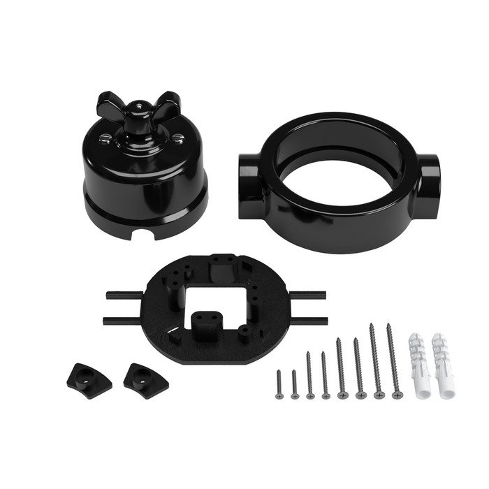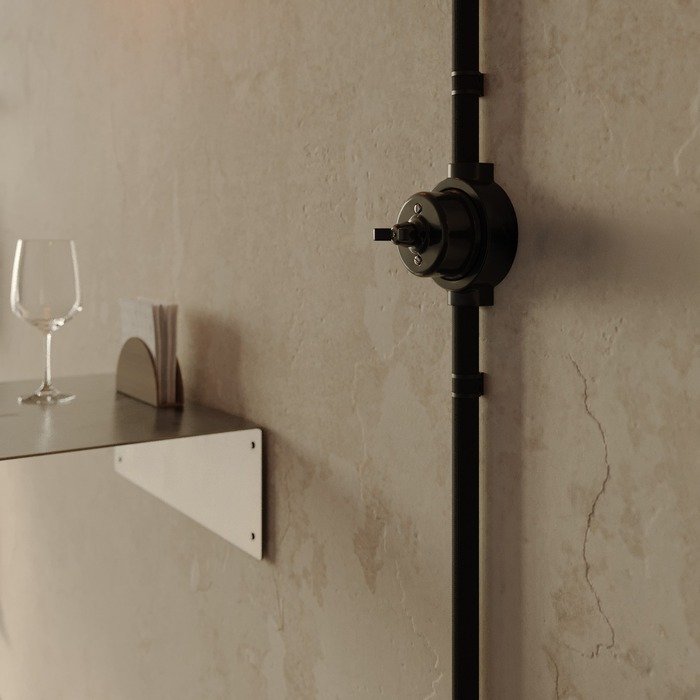 Černý otočný porcelánový vypínač s rámečkem a označením P-Nut-Base je praktickým a stylovým řešením pro vytvoření povrchové elektroinstalace systému Creative-Tube. Vyniká tradičním řemeslným zpracováním s autentickými estetickými prvky porcelánu a zároveň odpovídá současným standardům kvality, bezpečnosti a mechanické odolnosti. Originálně řešený otočný mechanismus, inspirovaný retro vzhledem motýlkové matice, zajišťuje nejen pohodlné a intuitivní ovládání světel, ale zároveň slouží jako výrazný designový prvek, který zaujme na první pohled v jakémkoli interiéru.