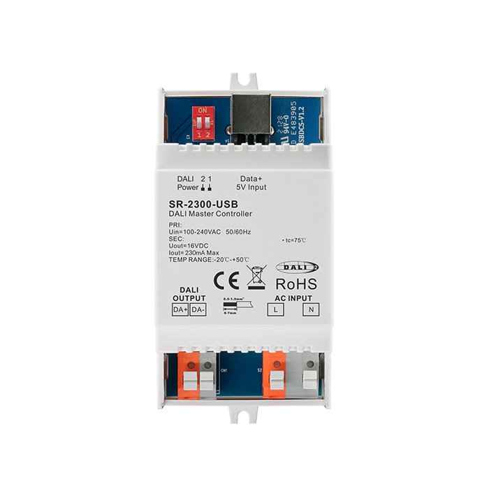 DALI Master SR-2300-USB s montáží na DIN lištu do elektrického rozvaděče je vysoce sofistikované elektronické zařízení navržené pro řízení a správu osvětlovacích systémů založených na protokolu DALI (Digital Addressable Lighting Interface). Zařízení disponuje jedním kanálem s vestavěnými DALI BUS zdrojem, který umožňují snadnou konfiguraci a ovládání připojených DALI zařízení. DALI Master Controller se vyznačuje vysokou spolehlivostí a precizním zpracováním, které zaručuje renomovaná značka Lux Miners by Sunricher. Je klíčovým prvkem při realizaci energeticky úsporných a inteligentních osvětlovacích systémů s pokročilou automatizací.