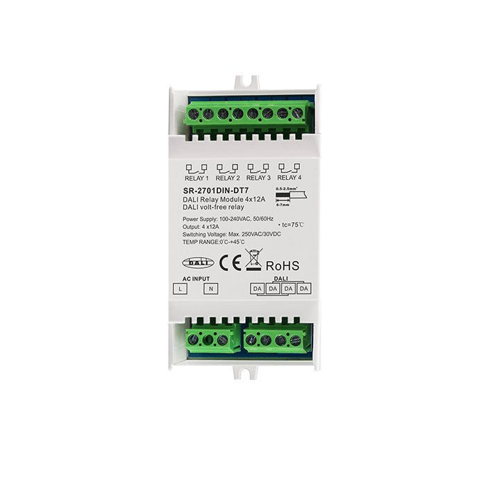 DALI-2 spínač 230V na DIN lištu SR-2701DIN-DT7 je navržen pro efektivní a flexibilní řízení osvětlení s využitím pokročilých funkcí. Pro lepší představu možností, je k dispozici #tablink#videa#produktové video##, které demonstruje jeho praktické využití. Čtyř-kanálové DALI relé 230V představuje spolehlivé řešení pro projekty, které vyžadují variabilitu a přesné řízení světelných systémů nebo spotřební elektroniky.