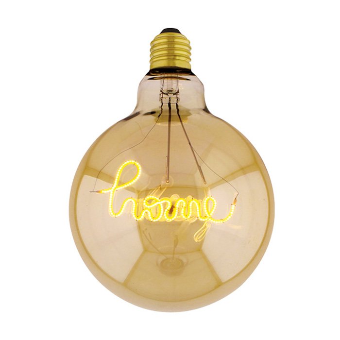 Stmívatelná HOME žárovka E27 závitu s produktovým označením Deco Up Gold o příkonu 5W je dekorativní a energeticky efektivní světelný zdroj. Vzhledem k oblíbenému tvaru jantarové skleněné baňky G125 (Globe - v nejširší části Ø 125mm) je skvělou alternativou do všech závěsných svítidel s objímkou E27. To co dělá žárovku Deco Up Gold mimořádným prvkem světlené dekorace je tvarování světleného vlákna do HOME nápisu. Při rozsvícení žárovky se projeví také výhody jantarového zbarvení skla. Vyzařované světlo proniká do prostoru nažloutlým teplým tónem světla. Stmívací HOME žárovka G125 produkuje scénické nebo harmonické osvětlení charakteristiky: