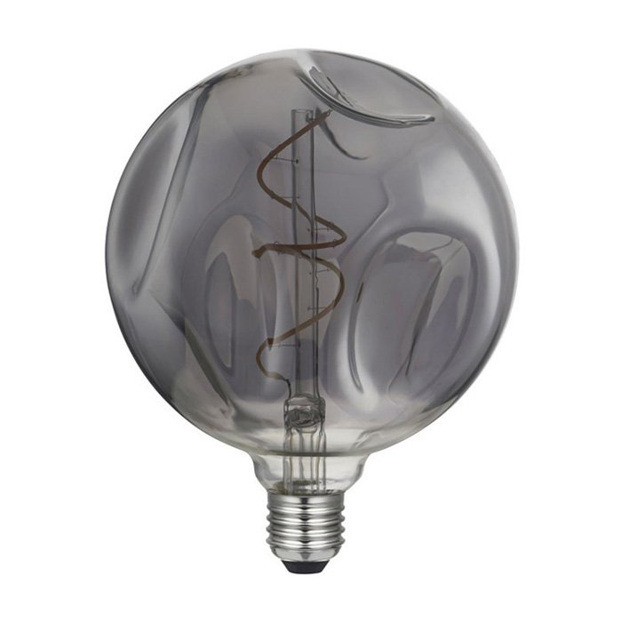 Stmívatelná designová žárovka E27 závitu s produktovým označením Bumped Smoky o příkonu 5W je dekorativní a moderní světelný zdroj. Vzhledem k oblíbenému tvaru kouřové skleněné baňky G140 (Globe - v nejširší části Ø 140mm) je skvělou alternativou do všech závěsných svítidel s objímkou E27. To co dělá žárovku Bumped Smoky mimořádným prvkem světlené dekorace je tvarování světleného vlákna do spirály. Mistrovským dílem je rovněž promáčknutý tvar kouřového skla baňky. Při rozsvícení design žárovky se projeví výhody obou výrobních technologií, které na sebe upoutají veškerou pozornost. Kombinace spirálového vlákna a promáčknutého skla design žárovky G140 Bumped Smoky produkuje scénické nebo harmonické osvětlení charakteristiky: