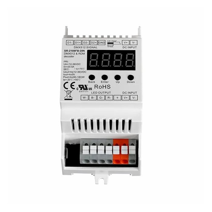 Čtyř kanálový DMX stmívač LED pásků SR-2108FB-RJ45-DIN s montáží na DIN lištu do elektrického rozvaděče je špičkové elektronické zařízení navržené pro ovládání LED pásků DIM (jedné barvy), CCT, RGB nebo RGBW. Poskytuje funkce jako zapnutí/vypnutí, plynulé stmívání nebo ovládání barev (RGB, RGBW) a chromatičnosti (CCT), které lze řídit prostřednictvím sběrnicového DMX512 protokolu. DMX stmívač pro LED pásky SR-2108FB-RJ45-DIN se vyznačuje spolehlivostí a vysokou kvalitou zpracování, kterou garantuje renomovaná značka Lux Miners by Sunricher.