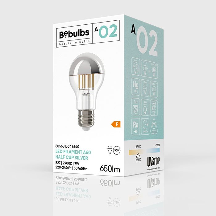 Stmívatelná LED žárovka se stříbrným zrcadlovým vrchlíkem BeBulbs-A a závitem E27 je speciální typ dekorativního světelného zdroje, který kombinuje funkčnost s estetickým efektem. Tradiční tvar kapky A60 (Drop - v nejširší části Ø 60mm) dokonale ladí s běžnými svítidly a spojuje klasický design s moderní LED technologií. Precizní technické zpracování spolu s renomovanou kvalitou značky BeBulbs garantuje špičkové světelné vlastnosti, vysokou účinnost a maximální spokojenost při každodenním používání.