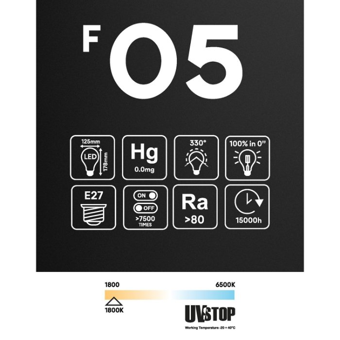 Kouřová skleněná baňka jemně tlumí intenzitu světla a vytváří příjemně rozptýlený, měkký efekt osvětlení. Díky tomuto efektu působí osvětlení decentně a elegantně, přičemž stále zachovává dekorativní charakter viditelných filamentů. Výsledkem je atmosférické světlo s harmonickou a sofistikovanou náladou charakteristiky: