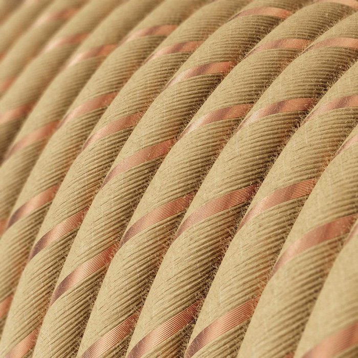 Materiálem látkového opletení pro jutový textilní kabel s označením Jute with Copper ERR04 je přírodní Juta zdobený měděným proužkem. Tato rafinované spojení dvou různých materiálů má několik charakteristických vlastností: