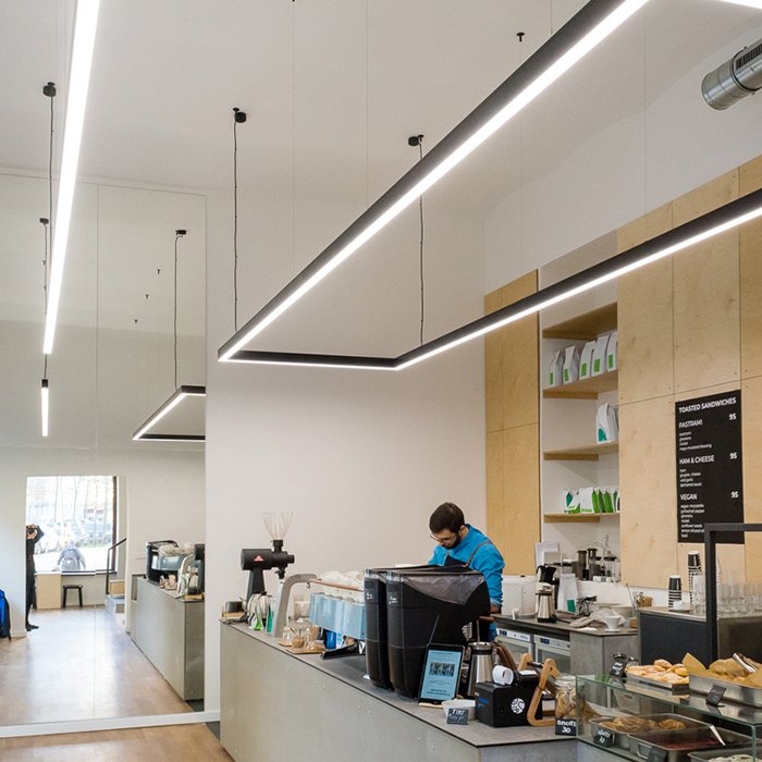 - Závěsné lineární osvětlení polygonálních tvarů - osvětlení prostor svěšeným stropním svítidlem | Vhodné pro osvětlení kanceláří a komerčních prostor.