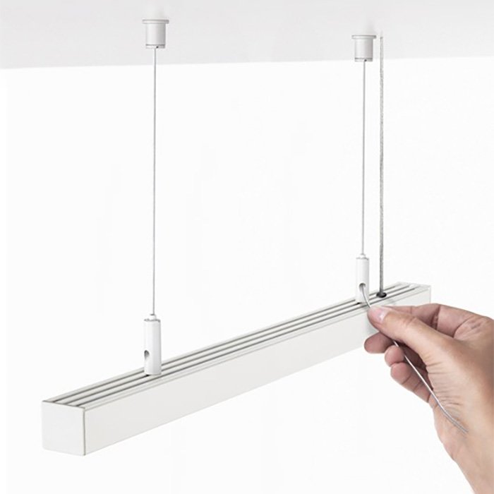 - Možnost regulace délky ocelového lanka posunutím v mechanismu závěsného systému. Zajištění požadované délky lanka je řešeno automatickou fixací - zámkem.