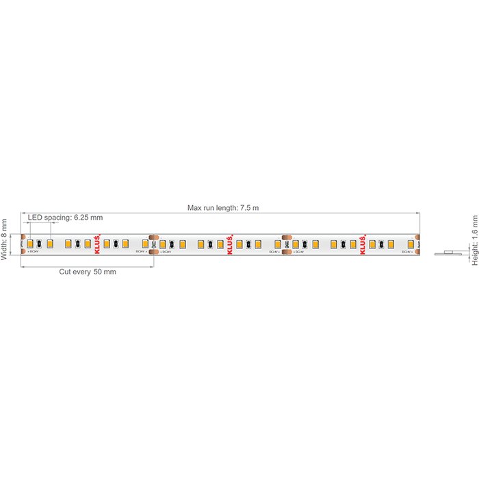 LED pásek KLUŚ K-0960-24 o příkonu 9,6W, napájecím napětí 24V a vysokým indexem podání barev CRI 90+ patří mezi vysoce kvalitní LED pásky se skvělými parametry, dlouhou životností a vysokou technickou hodnotou. KLUŚ poskytuje na tento produkt tovární záruku 7let. Kvalitní LED pásek osazený diodami SMD2835 neztrácí rychle svou svítivost a nehrozí u něj náhodná porucha některého z modulů nebo jednotlivých LED diod. Základem pro LED pásek je použitý podkladový materiál ve formě plošného spoje FPC (Flexible printed circuits) se zvýšeným podílem mědi. LED pásek je osazený nejkvalitnějšími LED diodami v počtu 140 LED/m a šířkou pásku 8mm. Při montáži do LED profilu s difuzorem tvoří svítící LED pásek 24V souvislou linii světla bez viditelných mezer mezi diodami pouze v případě montáže do hlubšího LED profilu. Ledkový pásek 24V je vhodný pro instalaci v interiéru. Splňuje třídu krytí IP20. Nemá zvýšenou odolnost proti vlhku a vodě.