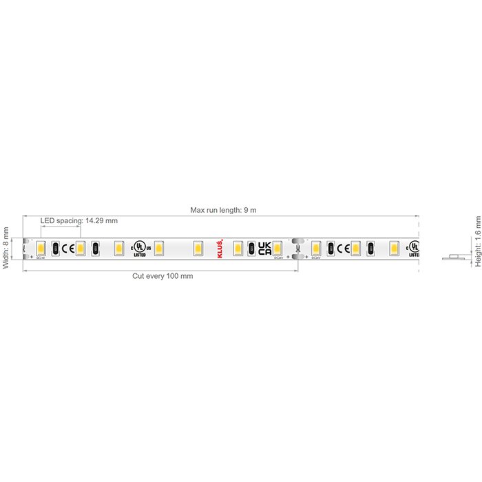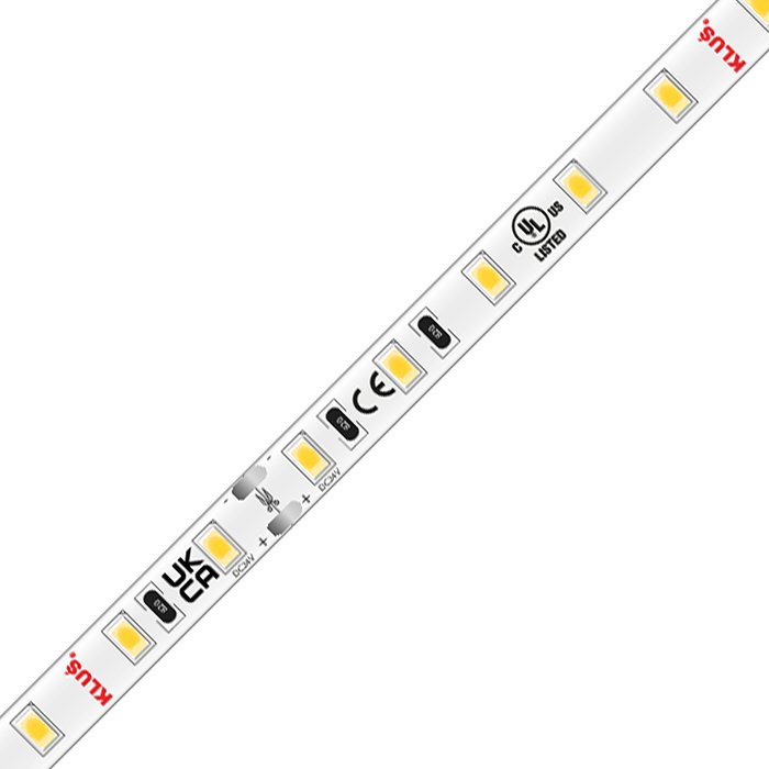 LED pásek KLUŚ K-CR-0480-24 o příkonu 4,8W, napájecím napětí 24V a vysokým indexem podání barev CRI 95+ patří mezi vysoce kvalitní LED pásky se skvělými parametry, dlouhou životností a vysokou technickou hodnotou. KLUŚ poskytuje na tento produkt tovární záruku 7let. Kvalitní LED pásek osazený diodami SMD5630 neztrácí rychle svou svítivost a nehrozí u něj náhodná porucha některého z modulů nebo jednotlivých LED diod. Základem pro LED pásek je použitý podkladový materiál ve formě plošného spoje FPC (Flexible printed circuits) se zvýšeným podílem mědi. LED pásek 24V je osazený nejkvalitnějšími LED diodami v počtu 70 LED/m a šířkou pásku 8mm. Při montáži do LED profilu s difuzorem tvoří svítící LED pásek souvislou linii světla bez viditelných mezer mezi diodami pouze v případě montáže do hlubšího LED profilu. Ledkový pásek 24V je vhodný pro instalaci v interiéru. Splňuje třídu krytí IP20. Nemá zvýšenou odolnost proti vlhku a vodě.