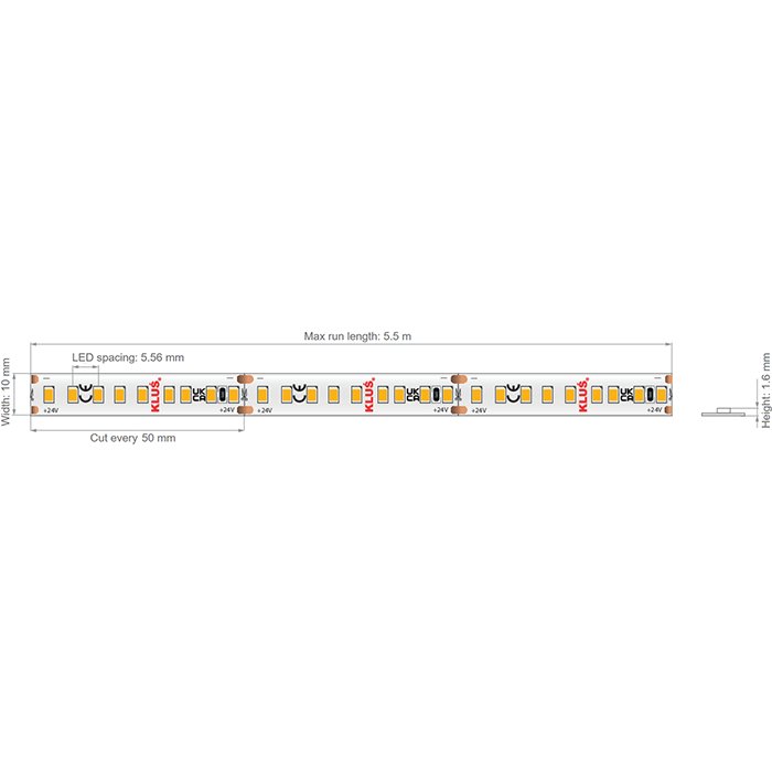 LED pásek KLUŚ K-VHE-0480-24 o příkonu 4,8W, napájecím napětí 24V a vysokým indexem podání barev CRI 90+ patří mezi vysoce kvalitní LED pásky se skvělými parametry, dlouhou životností a vysokou technickou hodnotou. KLUŚ poskytuje na tento produkt tovární záruku 7let. Kvalitní LED pásek osazený diodami SMD2835 neztrácí rychle svou svítivost a nehrozí u něj náhodná porucha některého z modulů nebo jednotlivých LED diod. Základem pro LED pásek je použitý podkladový materiál ve formě plošného spoje FPC (Flexible printed circuits) se zvýšeným podílem mědi. LED pásek 24V je osazený nejkvalitnějšími LED diodami v počtu 180 LED/m a šířkou pásku 10mm. Při montáži do LED profilu s difuzorem tvoří svítící LED pásek souvislou linii světla bez viditelných mezer mezi diodami pouze v případě montáže do hlubšího LED profilu. Ledkový pásek 24V je vhodný pro instalaci v interiéru. Splňuje třídu krytí IP20. Nemá zvýšenou odolnost proti vlhku a vodě.