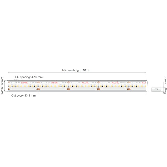 Voděodolný LED pásek KLUŚ KWP-HD-0480-24 o příkonu 4,8W, napájecím napětí 24V a vysokým indexem podání barev CRI>90 patří mezi vysoce kvalitní LED pásky se skvělými parametry, dlouhou životností a vysokou technickou hodnotou. KLUŚ poskytuje na tento produkt tovární záruku 4 roky. Kvalitní voděodolný LED pásek osazený diodami SMD2835 neztrácí rychle svou svítivost a nehrozí u něj náhodná porucha některého z modulů nebo jednotlivých LED diod. Základem pro LED pásek je použitý podkladový materiál ve formě plošného spoje FPC (Flexible printed circuits) se zvýšeným podílem mědi. LED pásek je osazený nejkvalitnějšími LED diodami v počtu 240 LED/m a šířkou pásku 12mm. Při montáži do LED profilu s difuzorem tvoří svítící LED pásek souvislou linii světla bez viditelných mezer mezi diodami pouze v případě montáže do hlubšího LED profilu. Ledkový pásek 24V je vhodný pro instalaci v interiéru i exteriéru. Venkovní LED pásek splňuje třídu krytí IP65. Má zvýšenou odolnost proti vlhku a vodě. LED pásek je umístěn v transparentním voděodolném krytu - pouzdru.