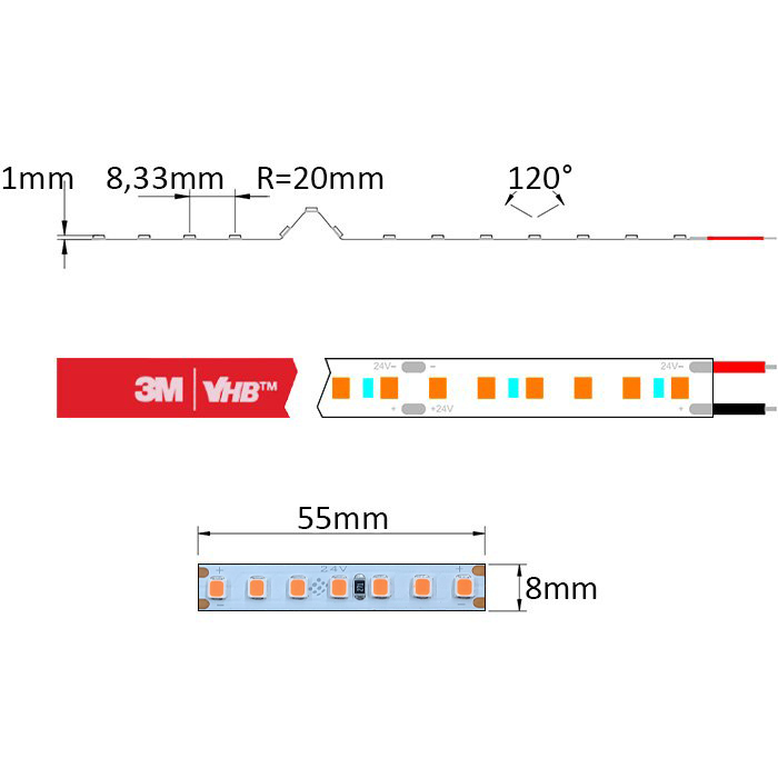 - SMD2835 (Surface-Mounted Device) technologie - zajišťuje vysokou účinnost díky efektivnímu pasivnímu chlazení LED čipů. Diody jsou umístěny v pouzdře na hliníkové chladicí podložce, což prodlužuje jejich životnost a umožňuje LED pásku SMD2835 24V dosahovat vynikající svítivosti a účinnosti s vyzařovacím úhlem 120°.