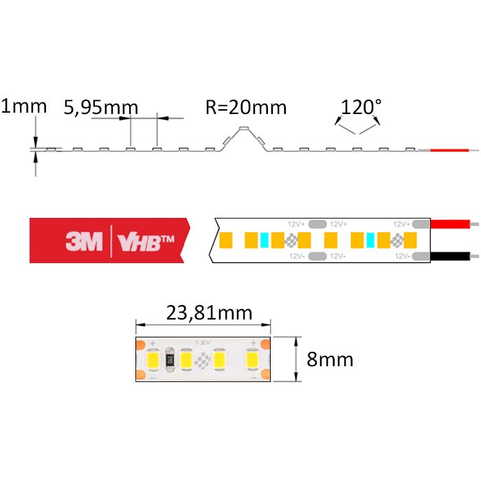 - SMD2835 (Surface-Mounted Device) technologie - zajišťuje vysokou účinnost díky efektivnímu pasivnímu chlazení LED čipů. Diody jsou umístěny v pouzdře na hliníkové chladicí podložce, což prodlužuje jejich životnost a umožňuje LED pásku SMD2835 12V dosahovat vynikající svítivosti a účinnosti s vyzařovacím úhlem 120°.