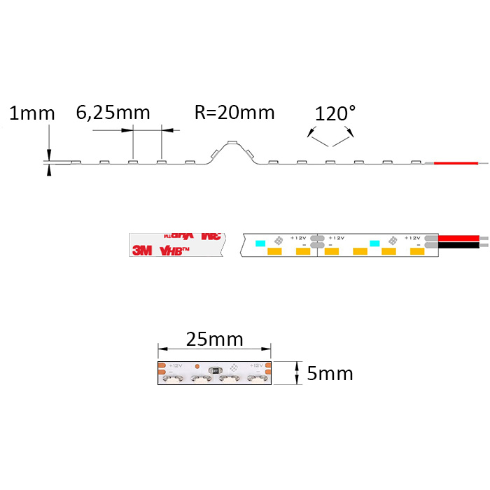 Stranová LED páska 12V SC12160 je na své spodní straně opatřena speciální oboustrannou lepenkou 3M VHB4914. Tato samolepící páska slouží k montáži na zvolený podklad (důrazně doporučujeme využít LED profilové lišty z důvodu chlazení a ochrany SIDE LED pásku). Ten musí být hladký a odmaštěný. Připojení 12V stranového pásku k napájecímu napětí doporučujeme provést pájením.