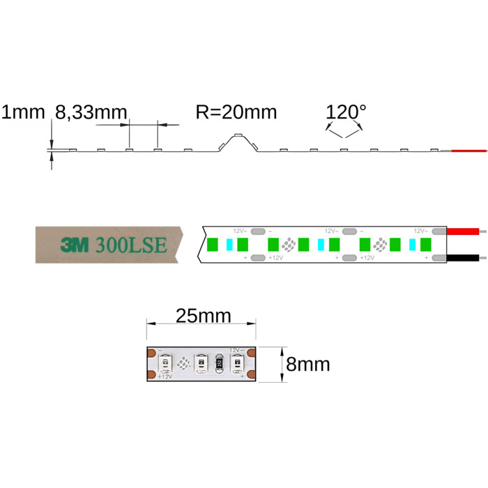 Zelená LED páska 12V SC12120E je na své spodní straně opatřena speciální oboustrannou lepenkou 3M 300LSE. Tato samolepící páska slouží k montáži na zvolený podklad (důrazně doporučujeme využít LED profilové lišty z důvodu chlazení a ochrany LED pásku). Ten musí být hladký a odmaštěný. Připojení 12V pásku k napájecímu napětí doporučujeme provést pájením.