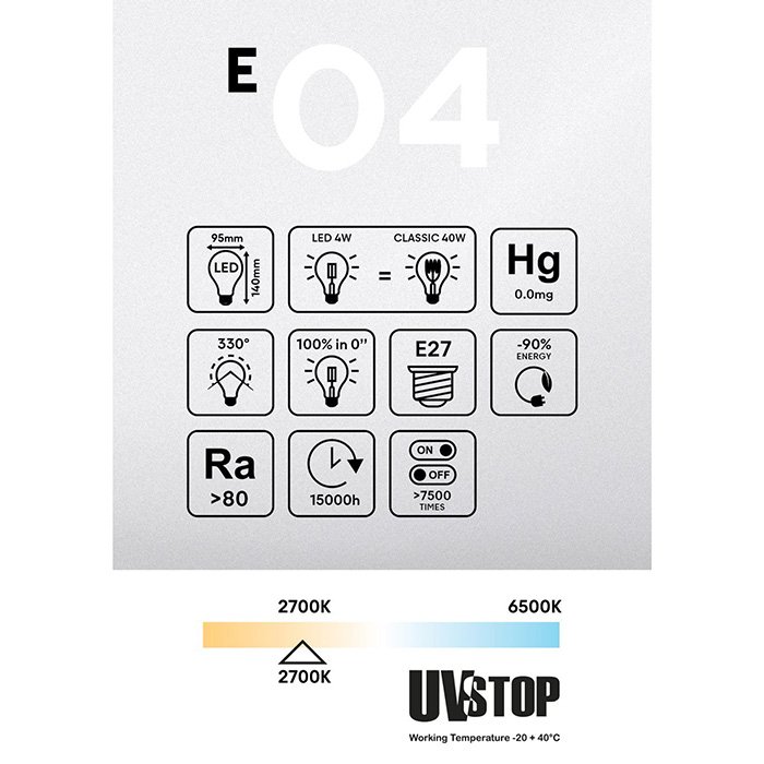 LED žárovka filament E27 závitu, s čirým sklem tvaru G95 a příkonem 4W je moderní vydání pro klasické a dříve používané žárovky. Svým plným kulatým tvarem skleněné baňky G95 (Globe - v nejširší části Ø 95mm) je skvělou alternativou do všech běžných svítidel s objímkou E27. Čiré zbarvení skla filament žárovky je vhodné pro dosažení velkého světelného výkonu bez difuze světla o charakteristice: