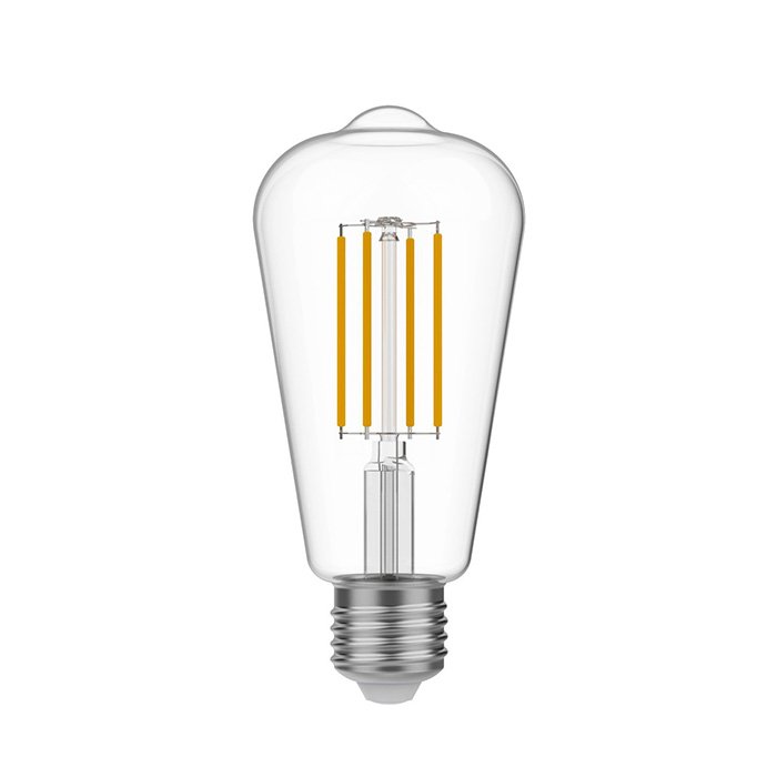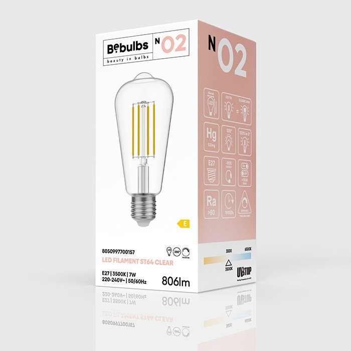 Čirá skleněná baňka zajišťuje maximální propustnost světla bez rozptylu a ztráty intenzity. Výsledkem je přirozené, jasné (až výrazně ostré) osvětlení, které zároveň podtrhuje dekorativní efekt viditelných filamentů. Tento design umožňuje dosažení světla charakteristiky: