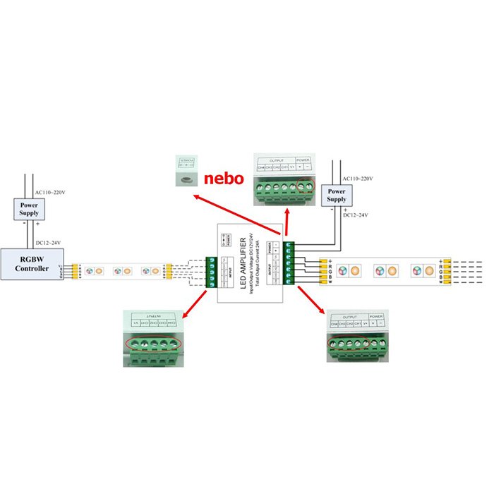 - Zesilovač navyšuje připojitelný příkon barevných LED pásků o 288W (12V), nebo 576W (24V)