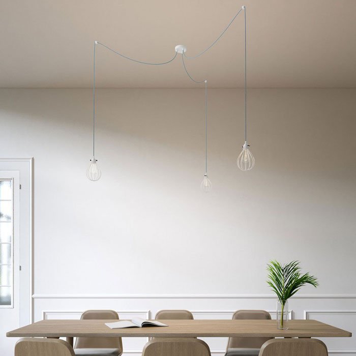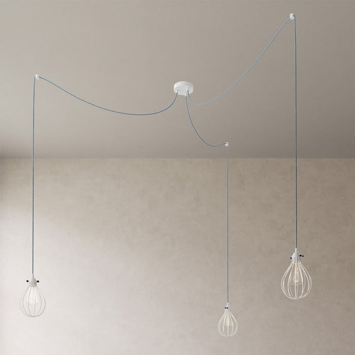 Lustr pavouk Spider se třemi drátěnými stínidly je jedinečné závěsné stropní svítidlo, které je funkční a dekorativní zároveň. Někdo by se mohl názvu pavouk obávat, ale to není vůbec třeba. Jedná se fascinující závěsné svítidlo s dvěma dlouhými rameny, jejichž polohu lze při montáži jakkoliv upravit. Náš Spider se třemi drátěnými stínidly může být dokonalou alternativou pro jakýkoliv velký lustr a skvělou volbou pro ty co hledají neobyčejný lustr do velkého prostoru. Lustr Spider se třemi drátěnými stínidly může osvítit rozsáhlou plochu stejně jako jeho ramena mohou být svěšena nad konkrétní místa v prostoru. Flexibilita a variabilita použití patří mezi největší výhody tohoto typu osvětlení. Všechny kreativní duše jistě potěší možnost výběru z více barevných variant. Veškeré komponenty jako 1x stropní rozeta, 3x textilní kabel v délce 300cm, 3x stropní háčky pro uchycení kabelu a 3x drátěná stínidla Drop s objímkou na žárovky E27 prošly důkladnou selekcí a byly sladěny do posledního detailu. Jejich jedinečný vzhled a kvalitu zaručuje výroba Made in Italy. Naším cílem bylo jednoduše stvořit výjimečný lustr pavouk vzhledu a vlastností.