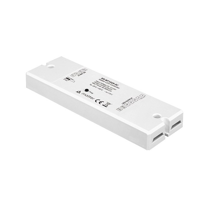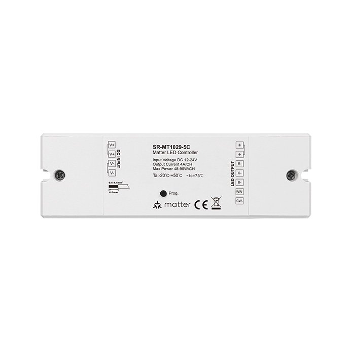 Matter RGBWW stmívač pro LED pásky SR-MT1029-5C je certifikovaným produktem (Connectivity Standards Alliance), který využívá pro přenos řídícího signálu kombinaci LAN, WIFI, Thread, Bluetooth Low Energy (BLE) standardů s cílem dosáhnout robustního, flexibilního a bezpečného systému pro ovládání chytré domácnosti. Klíčovou výhodou Matter RGBWW stmívače je jeho široká kompatibilita s produkty různých výrobců, které využívají technologii Matter. Tato zařízení spolu bezproblémově komunikují a mohou být integrována do jednoho systému osvětlení.