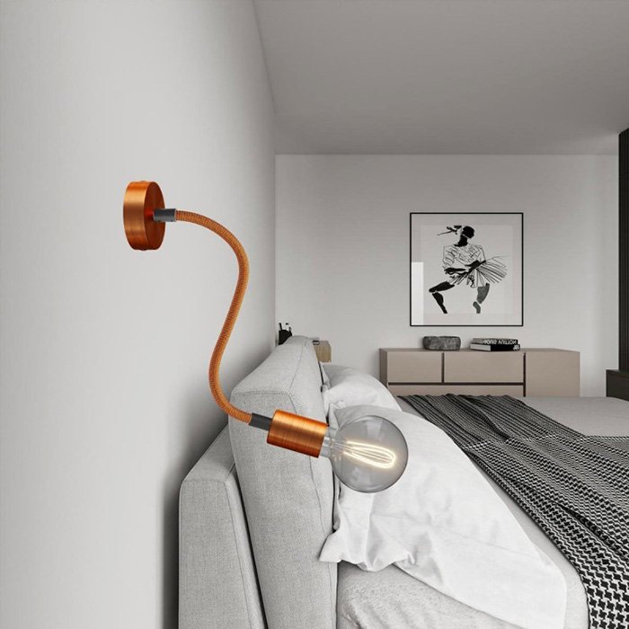 Opletený povrch z jemné Rayon textilie (umělé hedvábí) dodává kovovému husímu krku s robustní mechanikou mimořádný vzhled, díky kterému se stává nejen funkčním, ale i estetickým prvkem interiéru.