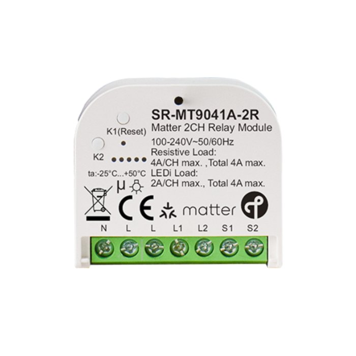 Matter dálkový spínač 230 V se dvěma kanály SR-MT9041A-2R je navržen pro efektivní a flexibilní řízení osvětlení a elektroniky s využitím pokročilých funkcí. Matter bezdrátový spínač 230V představuje spolehlivé řešení pro projekty, které vyžadují variabilitu a přesné řízení světelných systémů.