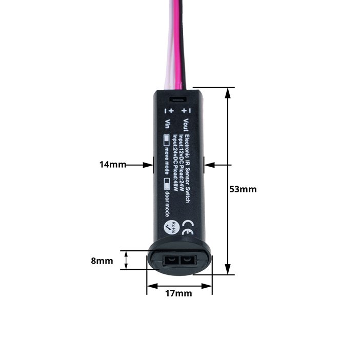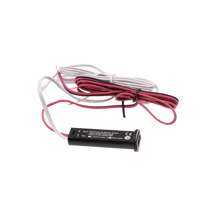 Vestavný nábytkový spínač 2V1 slouží k ovládání jednobarevných LED pásků. Výkon LED ovladače je 1x2A, lze k němu připojit LED pásky o celkovém výkonu 24W při napětí 12V a 48W při 24V. Je vhodný k montáži do nábytku a vestavbě do nábytkových desek. Skříňový spínač plní dvě funkce. Buď jako IR senzor. Takto funguje na principu překážky před senzorem (zavřená dvířka, šuplík a pod.), kdy je spínač rozepnutý. Pokud se překážka odstraní (šuplík, nebo dvířka se otevřou), spínač osvětlení sepne. Pokud se překážka vrátí zpět, spínač osvětlení vypne. Další funkce spínače je sepnutí mávnutím, kdy stačí před senzorem mávnout rukou a spínač osvětlení sepne. Po opětovném mávnutí osvětlení zase vypne.