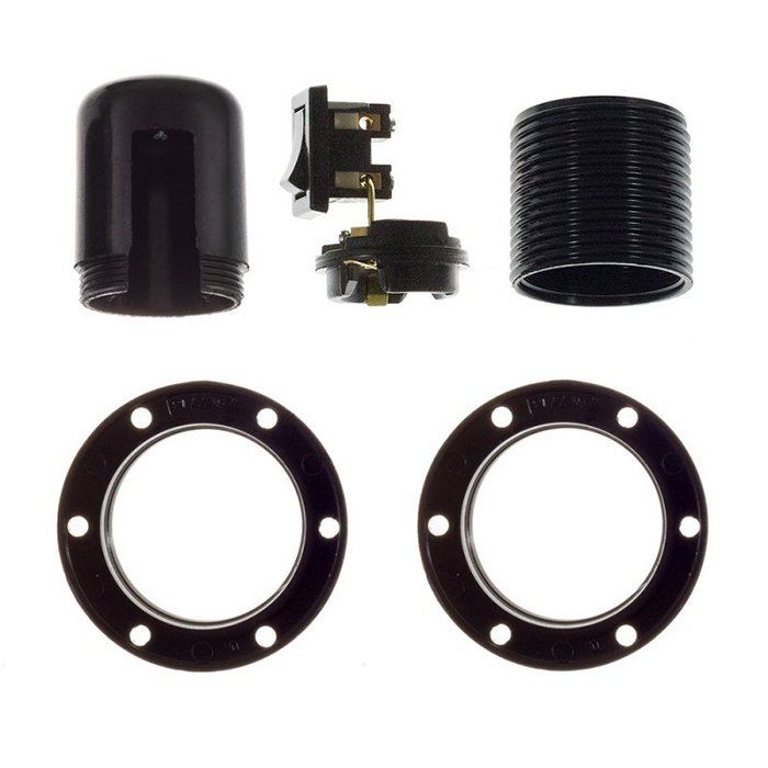 Bakelitová objímka pro žárovku E27 Bakeluna-SW je tvořena několika precizně zpracovanými částmi, které do sebe přesně zapadají a vytvářejí kompaktní a funkční celek. Konstrukčně se skládá z vnějšího krytu (dekorativního pláště) a vnitřního modulu s kontakty pro připojení přívodních vodičů: