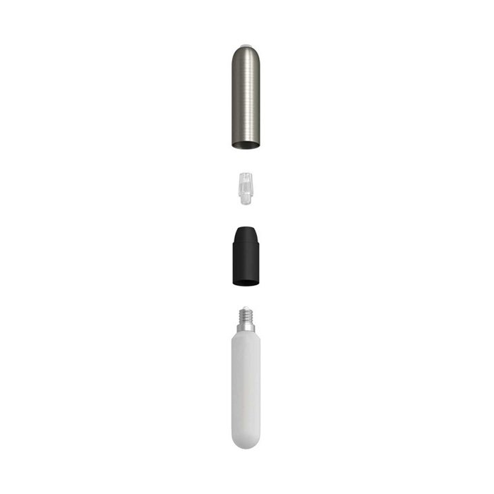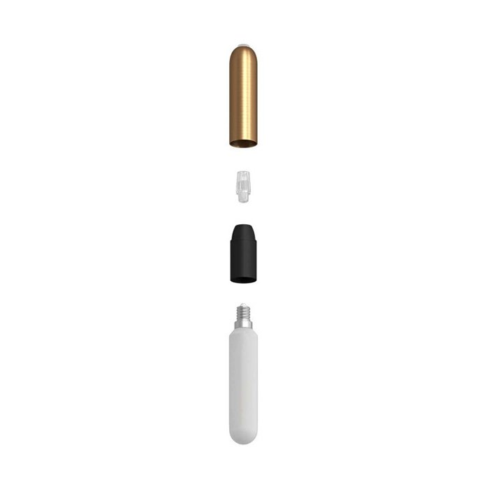 Kovová objímka pro žárovku E14 Metalpina je tvořena několika precizně zpracovanými částmi, které do sebe přesně zapadají a vytvářejí kompaktní a funkční celek. Konstrukčně se skládá z vnějšího krytu (dekorativního pláště) a vlastní funkční objímky určené k uchycení žárovky: