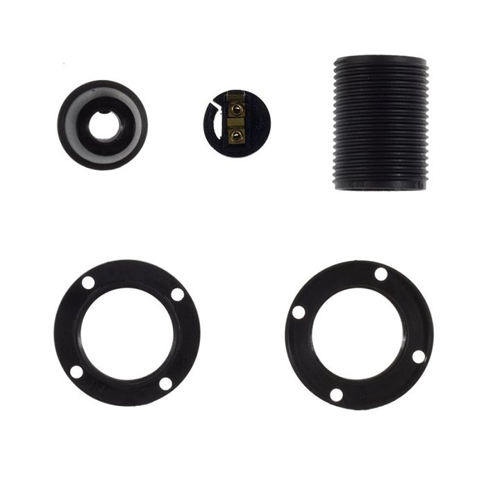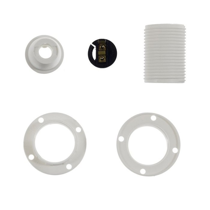 Plastová objímka pro žárovku E14 Plastili s možností montáže stínidla je tvořena několika precizně zpracovanými částmi, které do sebe přesně zapadají a vytvářejí kompaktní a funkční celek. Konstrukčně se skládá z vnějšího krytu (dekorativního pláště) a vnitřního modulu s kontakty pro připojení přívodních vodičů: