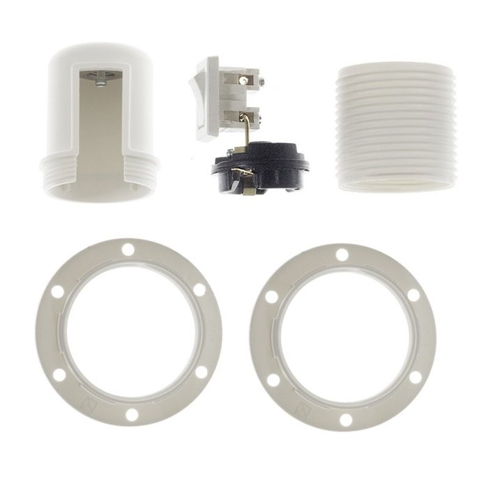 Plastová objímka pro žárovku E27 Plastuna-SW je tvořena několika precizně zpracovanými částmi, které do sebe přesně zapadají a vytvářejí kompaktní a funkční celek. Konstrukčně se skládá z vnějšího krytu (dekorativního pláště) a vnitřního modulu s kontakty pro připojení přívodních vodičů:
