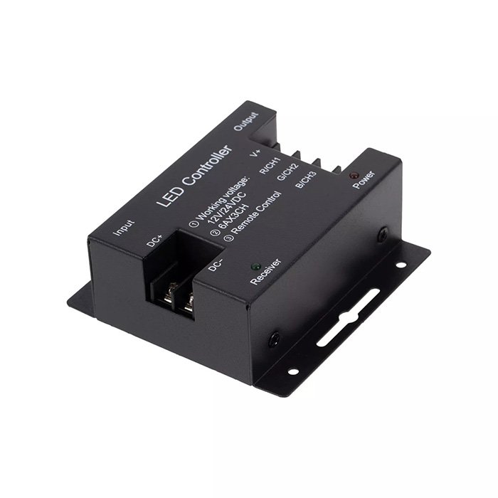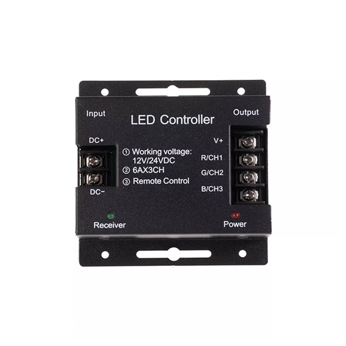 Výkon RGB přijímače je 3x6A, lze k němu připojit LED pásky RGB o celkovém výkonu 216W při napětí 12V a 432W při 24V. Dálkové ovládání RGB LED pásků je oblíbeným způsobem jak upravit intenzitu osvětlení. Díky rádiovému přenosu signálu je dosah ovladačů až 20m, bez nutnosti přímé viditelnosti. Proto může být přijímač schovaný např. v sádrokartonovém podhledu, nebo stěně, ve skříni a pod.