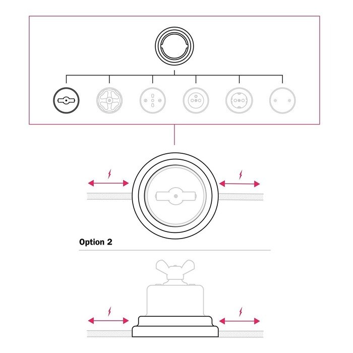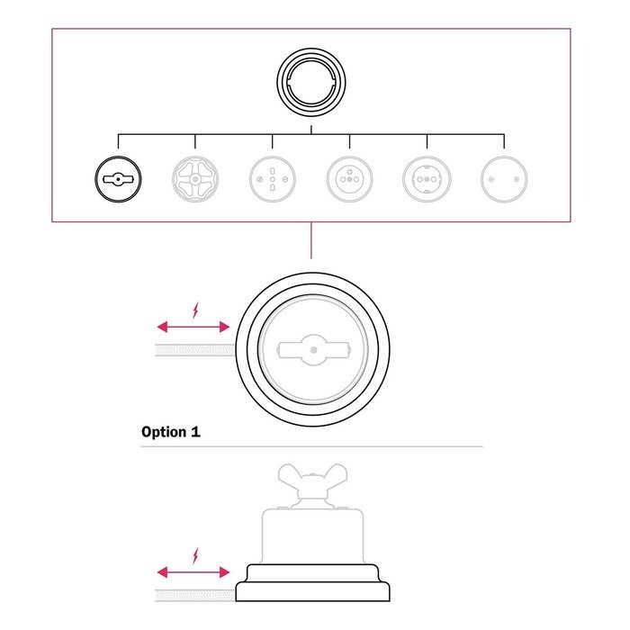 Vypínač P-Nut-Base je kompatibilní se všemi elektrickými kabely do průměru 8,5mm. Z naší nabídky můžete vybrat kabely a komponenty COMPACT 62 (3x0,75mm2) | MIDI 85 (3x1,5mm2). Díky modulární konstrukci je navíc snadno kombinovatelný s dalšími prvky systému porcelánových vypínačů, zásuvek a příslušenství Porcelain. Tato flexibilita umožňuje snadnou integraci do různých stylů interiérového designu.