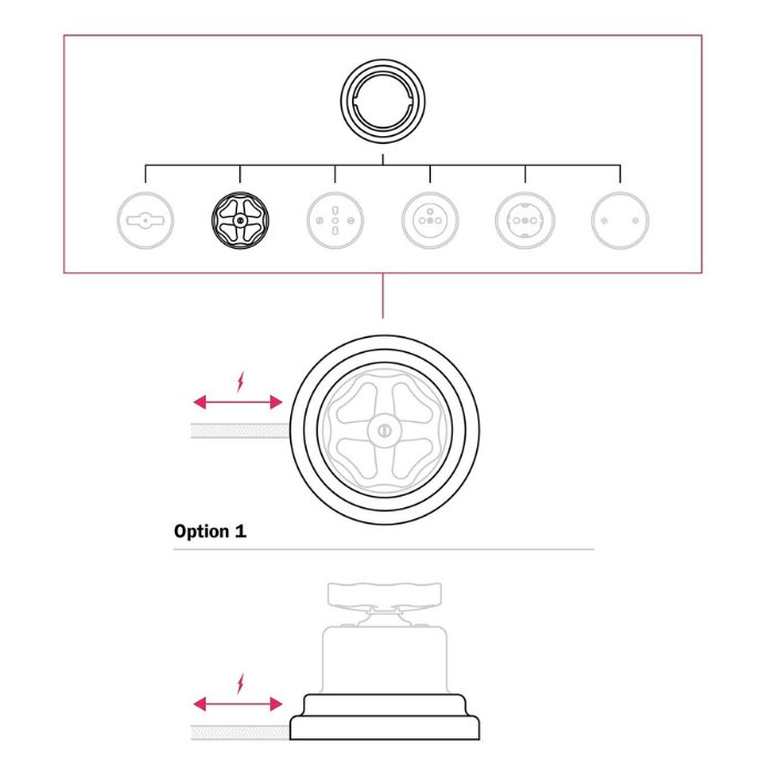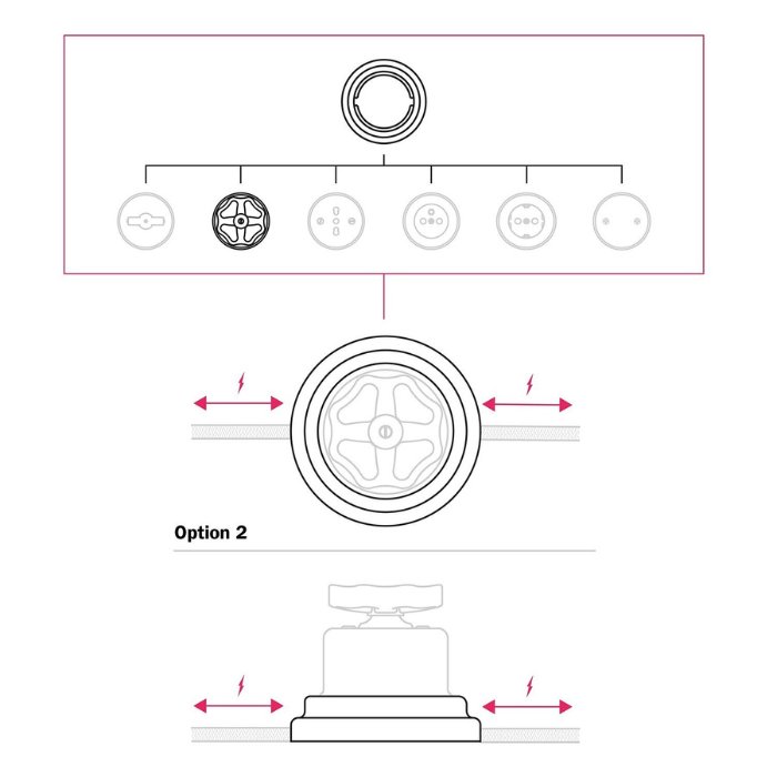 Vypínač P-Knob-Base je kompatibilní se všemi elektrickými kabely do průměru 8,5mm. Z naší nabídky můžete vybrat kabely a komponenty COMPACT 62 (3x0,75mm2) | MIDI 85 (3x1,5mm2). Díky modulární konstrukci je navíc snadno kombinovatelný s dalšími prvky systému porcelánových vypínačů, zásuvek a příslušenství Porcelain. Tato flexibilita umožňuje snadnou integraci do různých stylů interiérového designu.