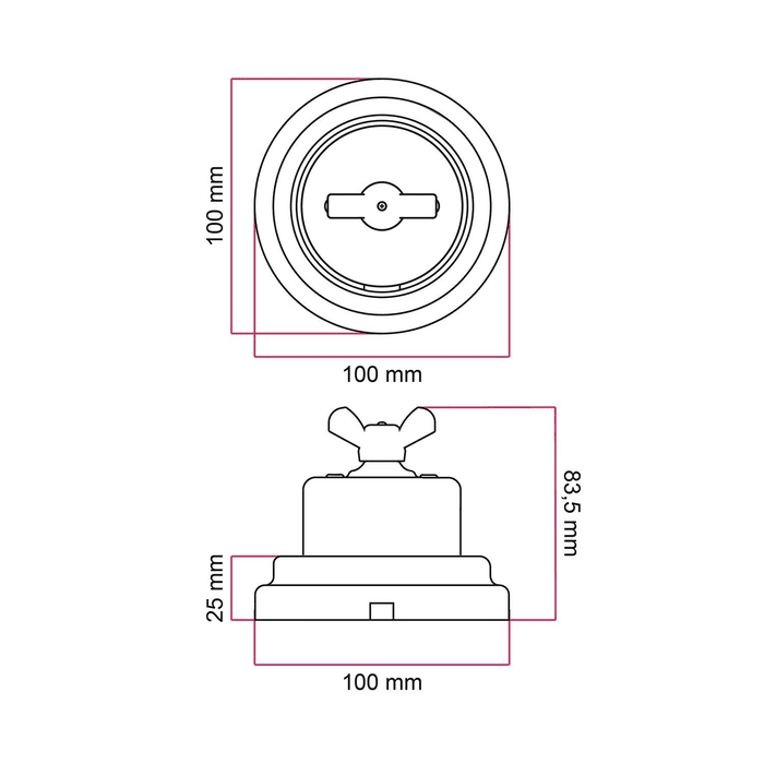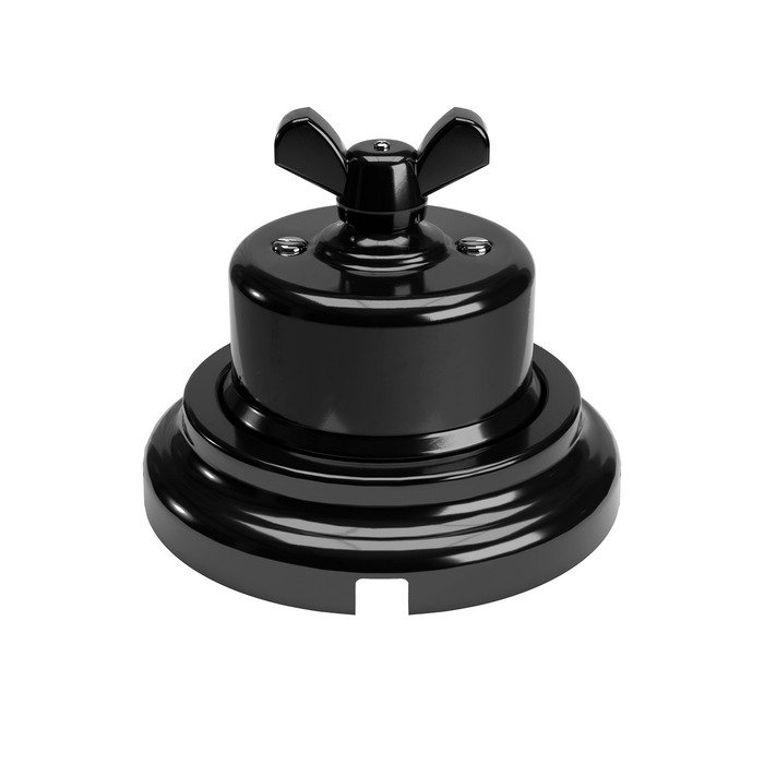 Černý otočný porcelánový vypínač s rámečkem a označením P-Nut-Base je praktickým a stylovým řešením pro vytvoření povrchové elektroinstalace. Vyniká tradičním řemeslným zpracováním s autentickými estetickými prvky porcelánu a zároveň odpovídá současným standardům kvality, bezpečnosti a mechanické odolnosti. Originálně řešený otočný mechanismus, inspirovaný retro vzhledem motýlkové matice, zajišťuje nejen pohodlné a intuitivní ovládání světel, ale zároveň slouží jako výrazný designový prvek, který zaujme na první pohled v jakémkoli interiéru.