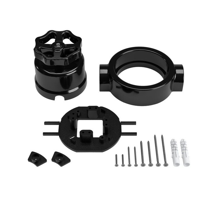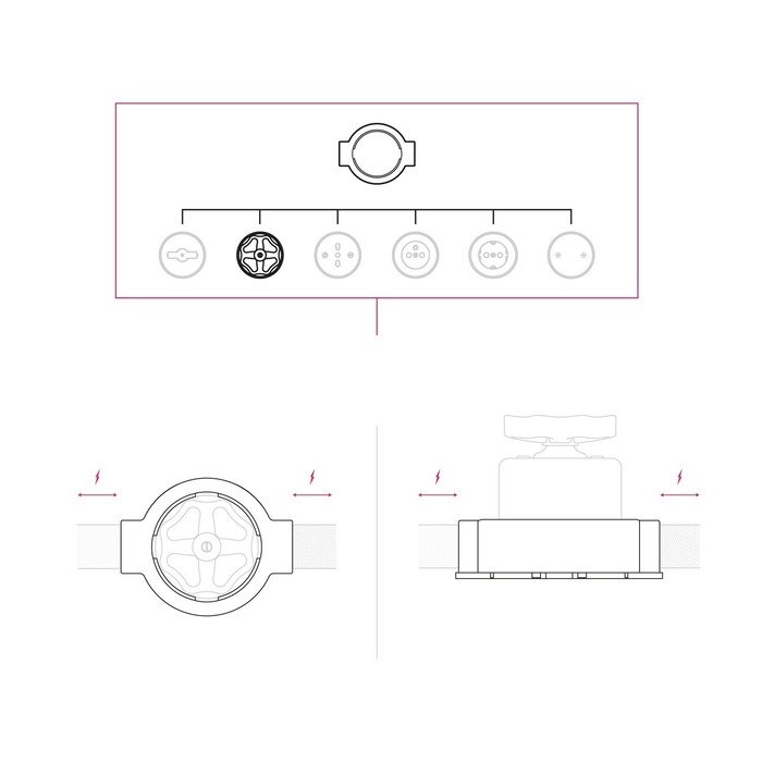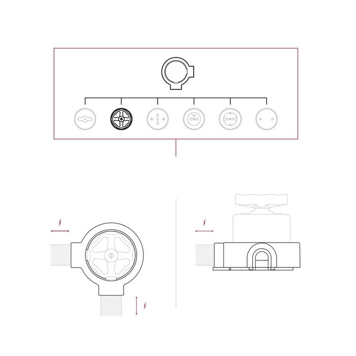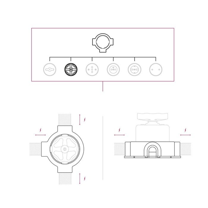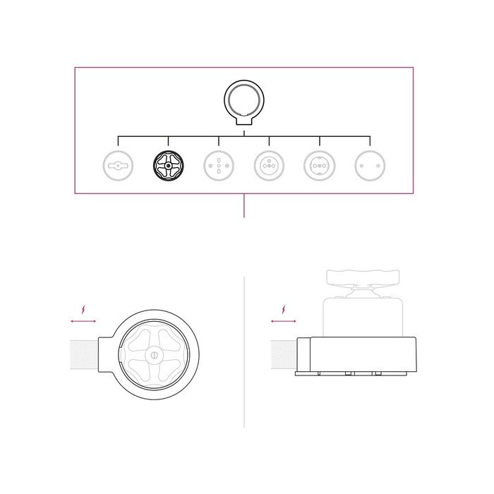 Porcelánová základna vypínače P-Knob-Base (nebo chcete-li instalační porcelánový rámeček) slouží jako praktický montážní prvek, který výrazně usnadňuje propojení přívodních kabelů z čtyř různých směrů (v závislosti na zvolené produktové variantě). Díky svému chytrému konstrukčnímu řešení umožňuje elegantní vedení kabeláže, přičemž veškeré spojení zůstává diskrétně a bezpečně ukryté uvnitř těla základny.
