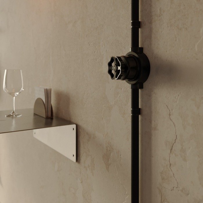 Černý otočný porcelánový vypínač s rámečkem a označením P-Knob-Base je praktickým a stylovým řešením pro vytvoření povrchové elektroinstalace systému Creative-Tube. Vyniká tradičním řemeslným zpracováním s autentickými estetickými prvky porcelánu a zároveň odpovídá současným standardům kvality, bezpečnosti a mechanické odolnosti. Originálně řešený otočný mechanismus, inspirovaný retro vzhledem vodovodních kohoutků, zajišťuje nejen pohodlné a intuitivní ovládání světel, ale zároveň slouží jako výrazný designový prvek, který zaujme na první pohled v jakémkoli interiéru.