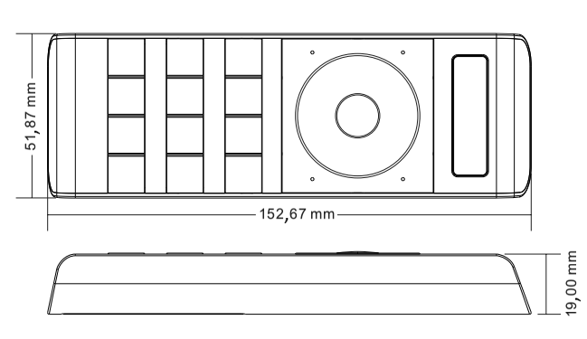 - Tlačítkové ovládání s dvěma dotykovými plochami - s funkcemi tlačítek pro krátký a dlouhý stisk. Dotykové plochy pro ovládání CCT chromatičnosti a RGB barev. Podrobný popis tlačítek najdete v manuálu v sekci „Ke stažení“.