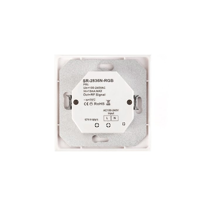 RF 230V nástěnný RGB ovladač SR-2836NRGB využívá pro přenos řídícího signálu rádiových vln s dosahem signálu až 20m. Toto bezdrátové řešení poskytuje vysokou míru flexibility se snadnou implementací zařízení do stávající elektroinstalace bez nutnosti složité kabeláže.