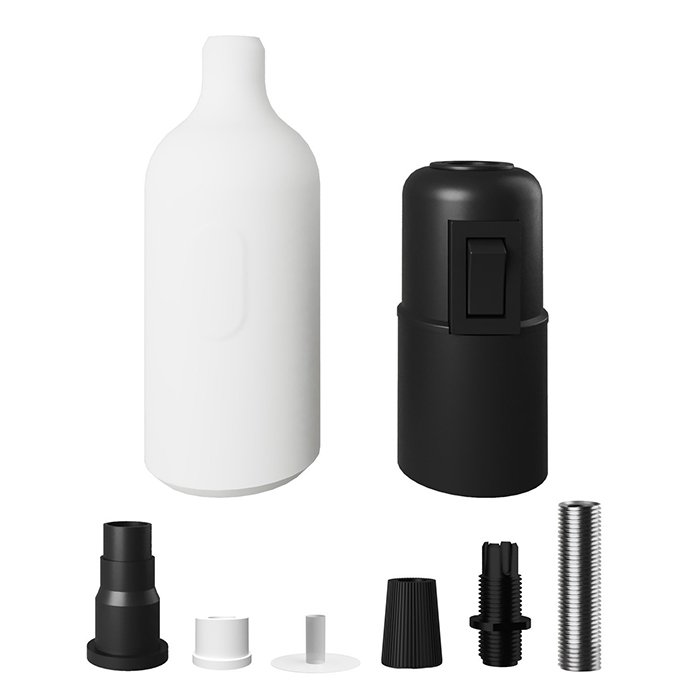 Silikonová E27 objímka s vypínačem Silicola-SW je tvořena několika precizně zpracovanými částmi, které do sebe přesně zapadají a vytvářejí kompaktní a funkční celek. Konstrukčně se skládá z vnějšího krytu (dekorativního pláště) a vlastní funkční objímky určené k uchycení žárovky:
