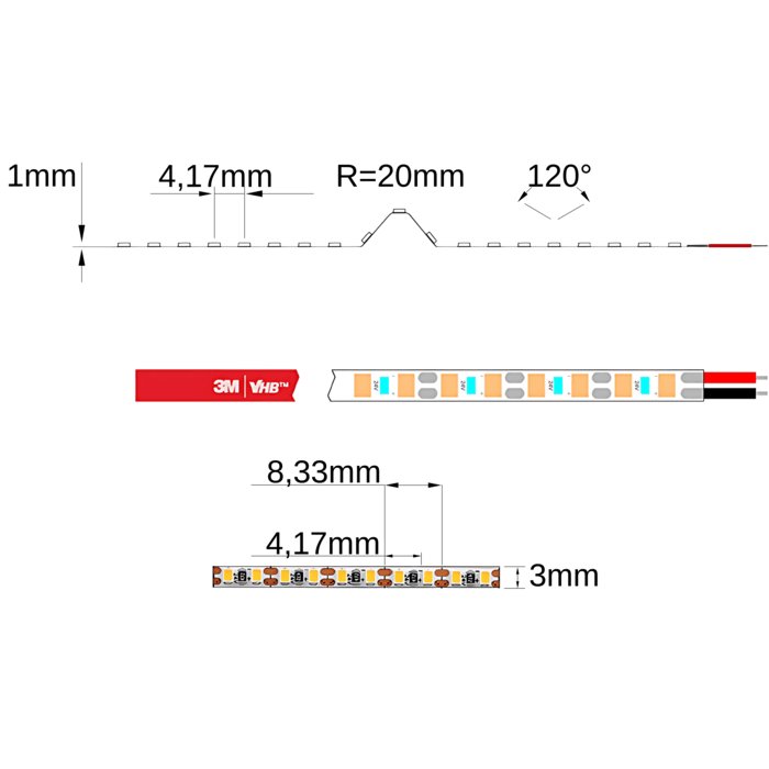 - 3mm šířka pásku - PCB (Printed Circuit Boards) je extra úzký, ideální pro aplikace vyžadující minimální rozměry při montáži.