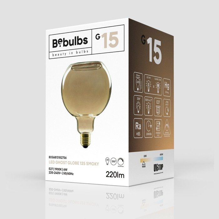 Kouřová stmívatelná LED žárovka E27 BeBulbs-G z kolekce GHOST představuje originální, atypický a luxusní designový prvek pro vytvoření výjimečné světelné dekorace. Otevřená dutá skleněná baňka připomínající svým tvarem glóbus G125 (Globe - v nejširší části Ø 125mm) s jemným LED COB vláknem po obvodu nabízí jedinečný vizuální i světlený efekt. Po montáži do objímky se tato žárovka ihned promění v dominantní svítidlo, které okamžitě upoutá veškerou pozornost. Precizní technické zpracování spolu s renomovanou kvalitou značky BeBulbs garantuje špičkové světelné vlastnosti, vysokou účinnost a maximální spokojenost při každodenním používání.