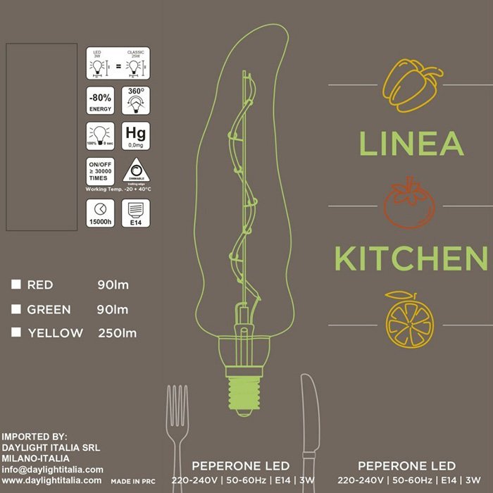 Kvalitu, efektivitu provozu a dlouhou životnost přes 15 000 hodin garantuje světově respektovaný výrobce žárovek DayLight Italia. Precizní technické zpracování se zaměřením na každý detail červené žárovky Pepper je to, čím tato společnost dosáhla významného podílu na trhu světelných zdrojů. Vzhledově atraktivní a kvalitní stmívatelná žlutá žárovka s technickými vlastnostmi jako: IC Driver Design a COB LED chip, (Ra)CRI80 dokáže v mnoha případech ospravedlnit vyšší pořizovací náklady.