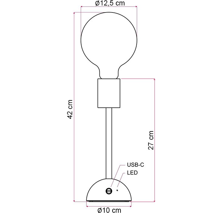 Přenosná stolní lampa bez kabelu Cabless02 je vybavena 5V žárovkou velikosti G125. Naopak součástí balení není USB-C kabel ani baterie typu Li-ion 18650.