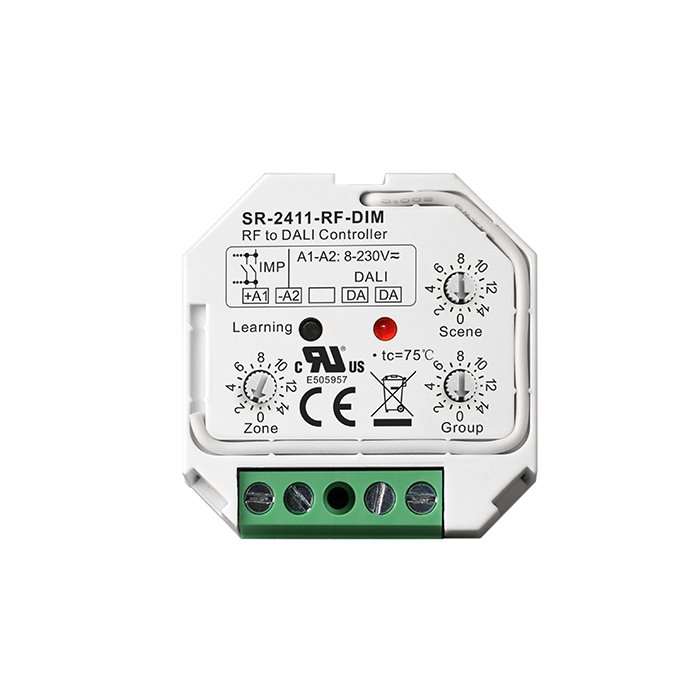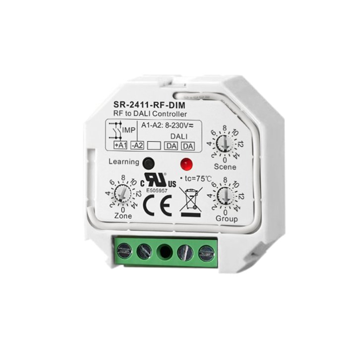 Převodník RF DALI s funkcí PUSH-DIM a označením SR-2411-RF-DIM je vysoce kvalitní elektronické zařízení určené pro flexibilní ovládání osvětlení. Jeho hlavní předností je možnost ovládat DALI svítidlo nebo skupinu svítidel pomocí radiofrekvenčního signálu kompatibilních ovladačů. Nadstavbu v podobě řízení osvětlení představuje také možnost připojení tlačítkového vypínače pomocí sběrnice PUSH-DIM. Převodník RF na DALI SR-2411-RF-DIM vyniká spolehlivostí a prvotřídní kvalitou zpracování, za kterou stojí renomovaná značka Lux Miners by Sunricher.