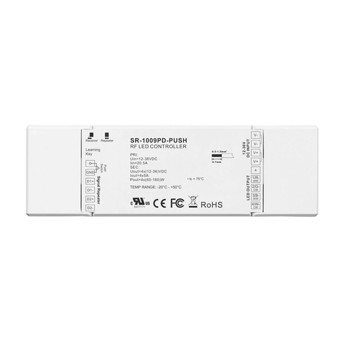 Čtyř kanálový rádiový RF stmívač LED pásků SR-1009NPD-PUSH je špičkové elektronické zařízení navržené pro ovládání LED pásků CCT, RGB nebo RGBW. Poskytuje funkce jako zapnutí/vypnutí, plynulé stmívání nebo ovládání barev (RGB, RGBW) a chromatičnosti (CCT), které lze řídit buď bezdrátově prostřednictvím rádiového RF signálu, nebo také pomocí sběrnicového PUSH DIM rozhraní. RF stmívač pro LED pásky SR-1009NPD-PUSH se vyznačuje spolehlivostí a vysokou kvalitou zpracování, kterou garantuje renomovaná značka Lux Miners by Sunricher.